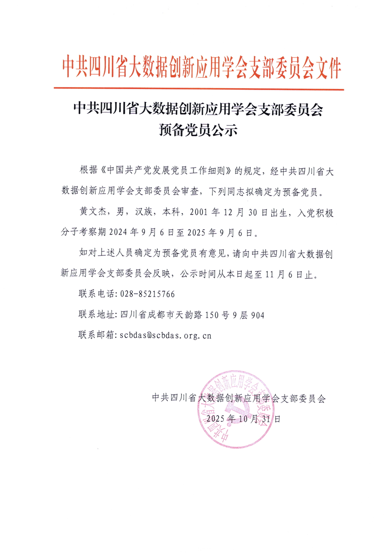 中共四川省大数据创新应用学会支部委员会预备党员公示